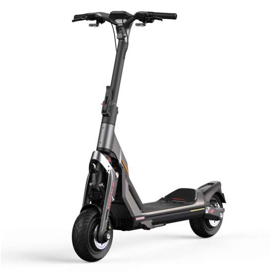 Patinete eléctrico premium con motor trasero, autonomía de hasta 70 km, velocidad máxima de 25 km/h, doble suspensión hidráulica ajustable, frenos de disco delantero y trasero, neumáticos autorreparables sin cámara de 11 pulgadas, pantalla a color y conectividad con app Segway.